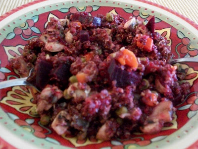 I guess you could say I’m on a quinoa kick. It might be due to the fact that I found out that certain really healthy foods had waaaay to much fiber for my body to handle. Quinoa seems to work really well for me and I’ve been sort of using it as a replacement for some foods I’m not eating as much these days. So much for being told to eat lots of fresh fruits, veggies and whole grains – I guess you can get too much of a good thing! The other reason I’m on a quinoa kick is that my favorite guy has celiac disease, which means that he can’t have anything that contains gluten. But mostly, I think that Quinoa is a fabulously delicious and a wonderful grain-like food that is fun to cook because of its versatility. Here’s a quick and yummy way to prepare, serve and eat red quinoa. Oh, by the way, I need to give Asunta credit for giving me the idea to add beets. She recently shared a recipe with me that she called “Red Velvet Rice” and it was quite inspiring! I love what happens to the color of this dish, especially how the orange carrots take on a beautiful rose color. I think you’ll enjoy this one!